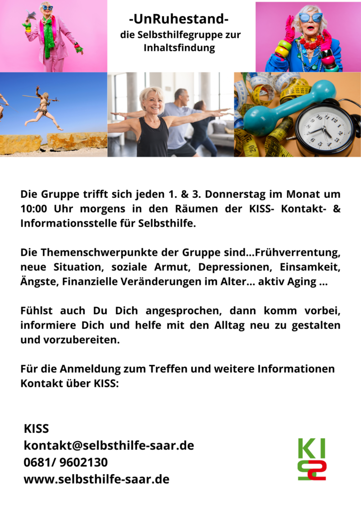 Wir treffen uns donnerstags um 18:30 in den Räumlichkeiten der KISS (Kontakt- und Informationsstelle für Selbsthilfe im Saarland) 66111 Saarbrücken, Futterstr. 27, Tel.: 0681 9602130