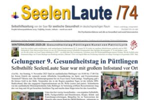S e e l e n L a u t e. Die unabhängige Selbsthilfezeitung für seelische Gesundheit von der Saar. Kritisch, undogmatisch und für alle Interessierten. Erscheint deutschlandweit 5-6 x im Jahr, als reguläres Informationsorgan der herausgebenden Selbsthilfen SeelenWorte RLP und SeelenLaute Saar, gefördert in Rheinland-Pfalz projektbezogen im Verbund von Betriebskrankenkassen sowie in der Bewerbung und Verteilung ergänzend aus Mitteln der GKV-Selbsthilfe-Gemeinschaftsförderung Saarland und des Landkreis Merzig-Wadern. Verbreitung im gesamten deutschsprachigen Lesegebiet über Post- und Email-Verteiler auf Spendenbasis, zusammen mit der Online-Ausgabe an mehrere tausend Leser*innen. Druckauflage (mit bedarfsweisen Nachdrucken) über 4.000 verteilte Ex. im Jahr